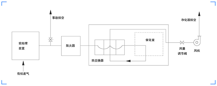燃烧过程:催化燃烧过程是在催化燃烧装置中进行的。有机废气先通过热交换器预热到200-400℃,再进入燃烧室,通过催化剂床时,碳氢化合物的分子和混合气体中的氯分子分别被吸附在催化剂的表面而活化。由于表面吸附降低了反应的活化能,碳氢化合物与氧分子在较低的温度下迅速氧化,产生二氧化碳和水。