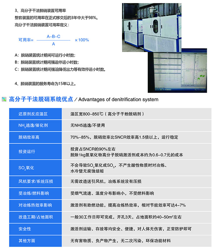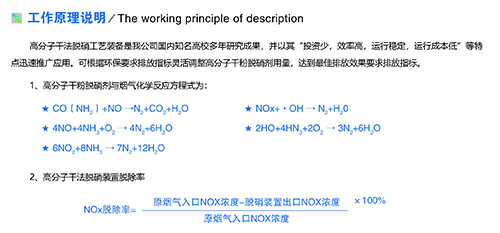 9、高分子干法脱硝工艺是利用计算流体力学(CFD)和化学动力学模型(CKM)进行工程设计,将虚拟现实设计技术与特定燃烧装置尺寸、燃料燃料类型和特性、分解炉负荷范围、燃烧方式、过剩空气、初始或基线氮氧化物浓度、烟气温度分布、炉膛烟气流速分布、烟气的实际情况等相结合进行工程设计。该技术是采用我司专门研发的高分子粉体输送系统将我司专有技术产品一高分子干粉脱硝剂喷入炉瞠或者烟道温度在800℃-950°℃的区域,被高温激活气化后,高分子干粉脱硝剂迅速(0.6-0.8s)与烟气中的氮氧化物发生化学反应,还原成N/H;O/少CO₂,不产生任何对冶炼和人体危害性的成分,实现NOX达标排放要求。
